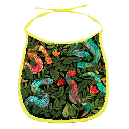 A gouache and watercolour painting of vibrant little snakes and folk style flowers on a black background.