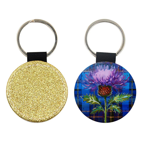 An acrylic painting of the Scottish thistle on a blue tartan background.