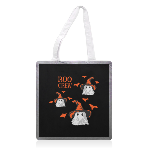 Boo Crew Halloween Ghost with Witch Hat and Bats - printed canvas tote bag by EZbie
