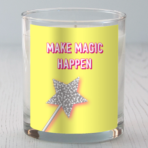 We all need some magic in our lives so make it happen. Silver sparkle star wand on a yellow background.
