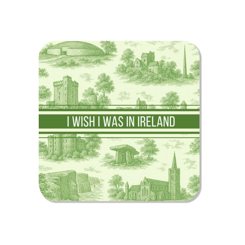 A green toile print of Irish monuments and landmarks.