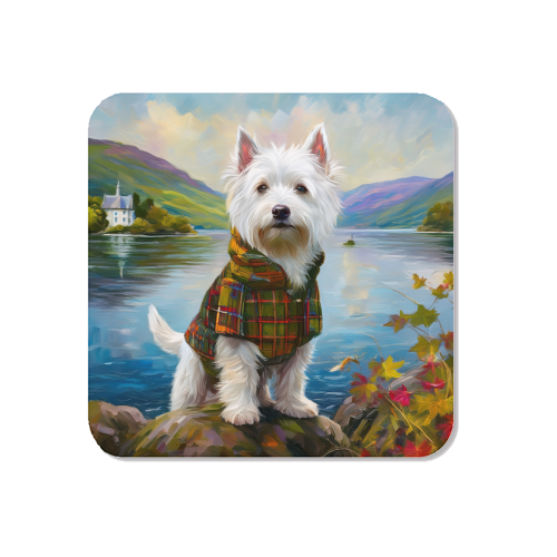 An acrylic painting of a Highland Terrier in tartan on Loch Lomond.