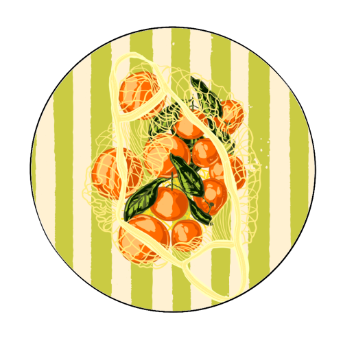 A zesty bundle of tangerines rests effortlessly in a sunny mesh bag, set against cheerful lime stripes. This bright and playful still life blends retro charm with modern fruitcore flair — perfect for kitchens, studios, or anywhere in need of a citrusy spark.